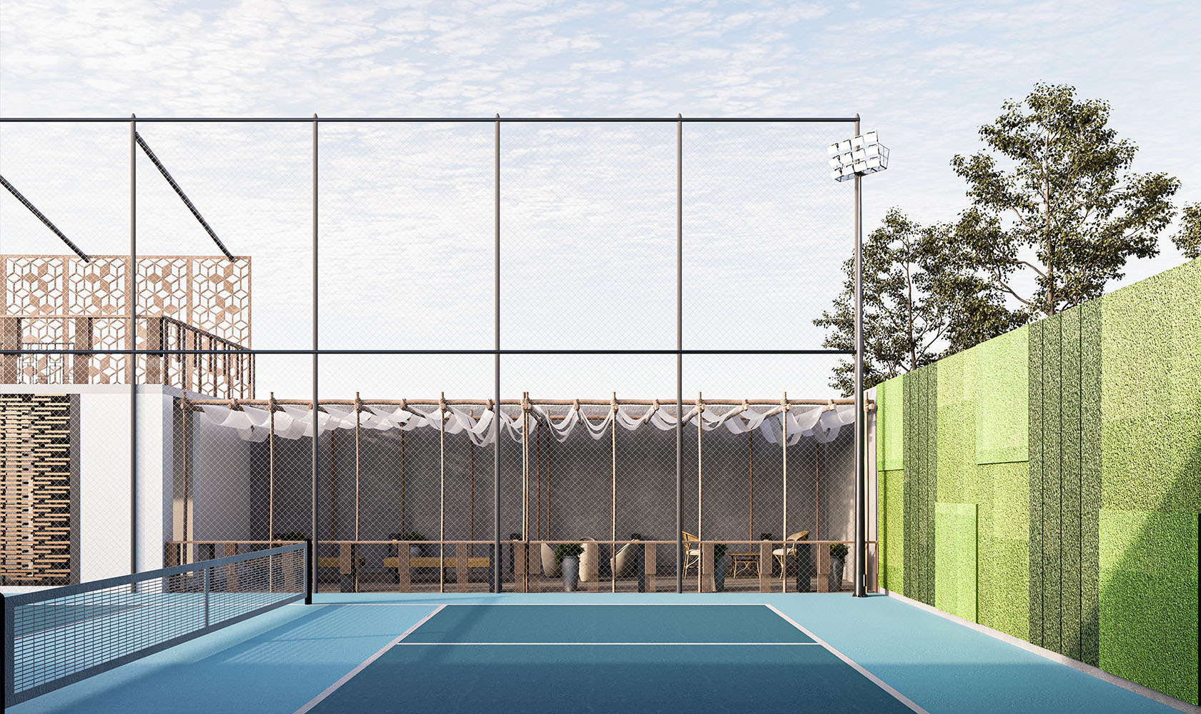 The requirement was a simple one. The clients wanted two playable courts with a seating area that's covered. The idea was to run a pickleball club as Chennai city was booming with pickleball courts all across. We segregated the courts and the passage with a mesh net in between to prevent from the play being disrupted. The facade design indicates two people playing pickleball and we just placed greenery at its base to give an aesthetically pleasant appearance.