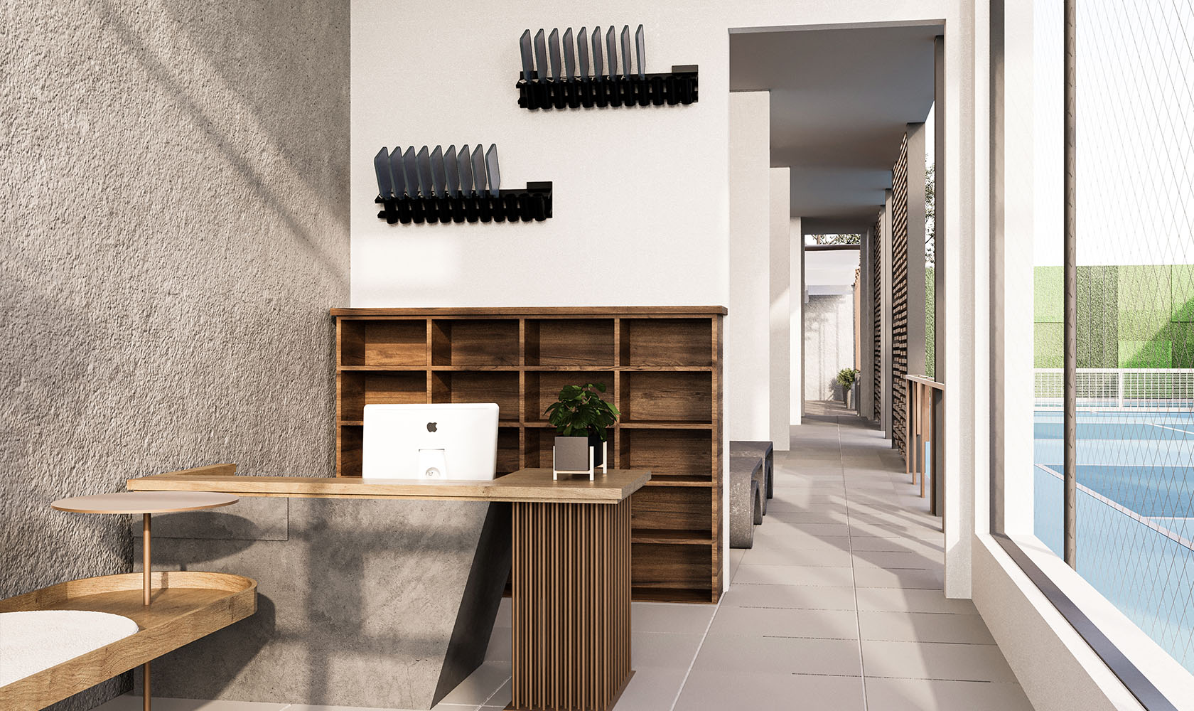 The initial idea was for the roof to act as an outdoor gathering area which was later just left as an open gallery space during the execution. All in all, this is a project that turned out pretty much as it was initially intended to be designed with minimal changes during the execution. We had to place artificial turf all across the courts on one side to prevent players from banging into the wall and it ended up as another highlighting feature of the court.